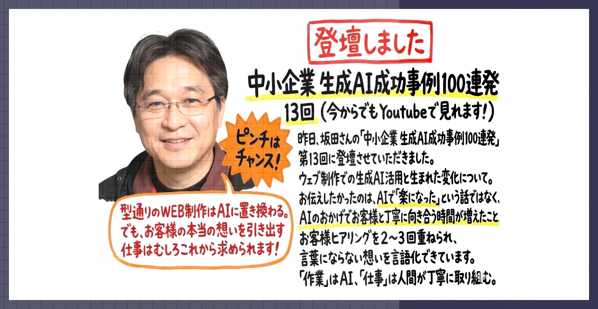 先日、坂田さんの「中小企業 生成AI成功事例100連発」第13回に登壇させていただきました。