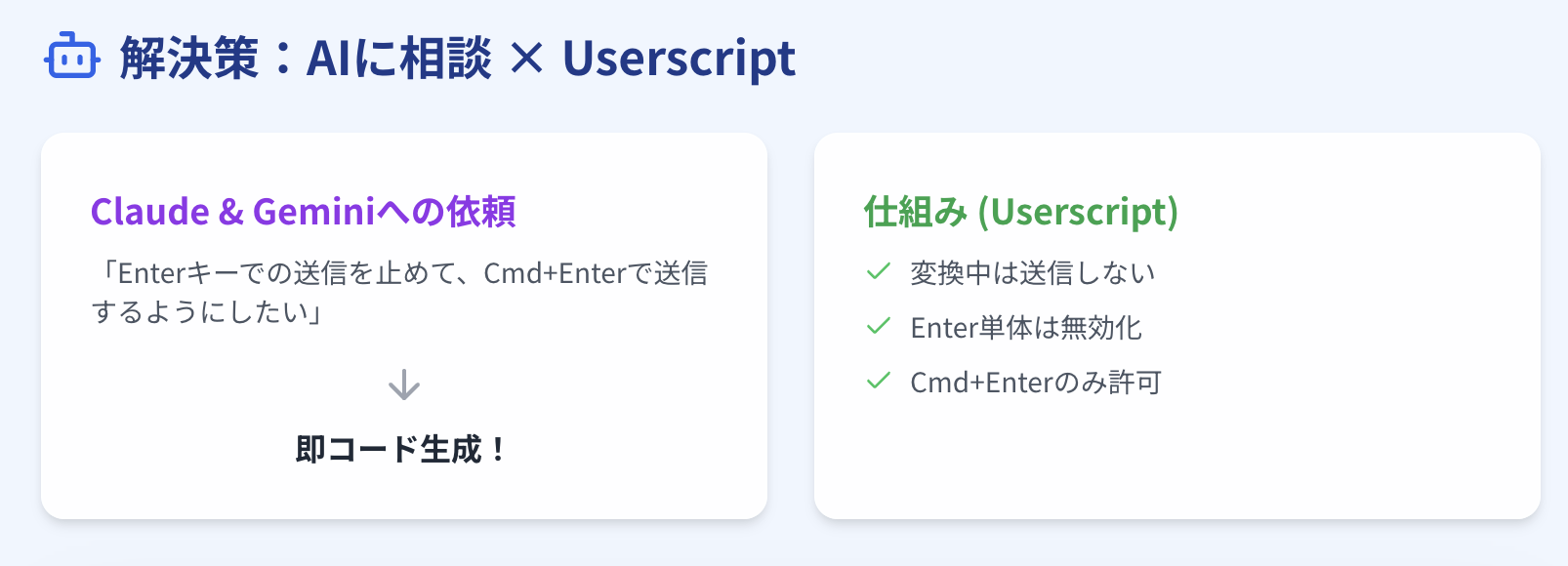 そこで、「Enterキーでの送信を止めて、Cmd+Enterで送信するようにしたい」と、ClaudeとGemini 2に相談してみました。