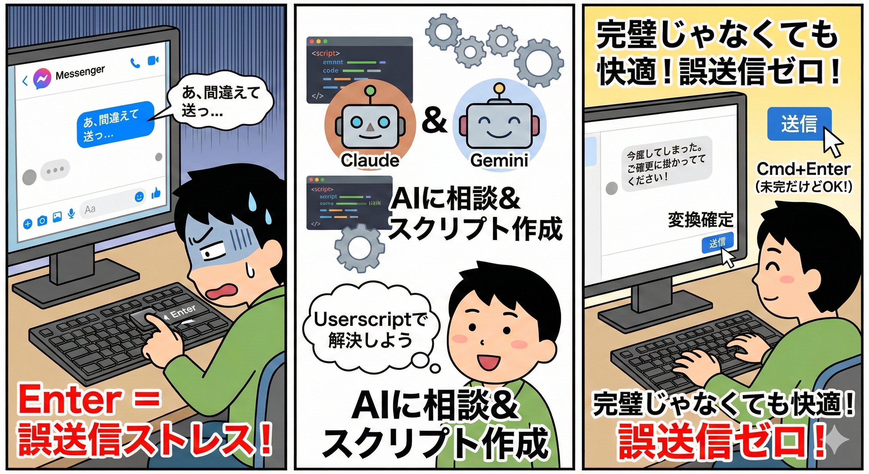 - MacのSafariでFacebook Messengerを使うと、日本語入力時にEnterキーを押すと誤送信されてしまう問題を、生成AI(ClaudeとGemini)に相談してUserscriptで解決した