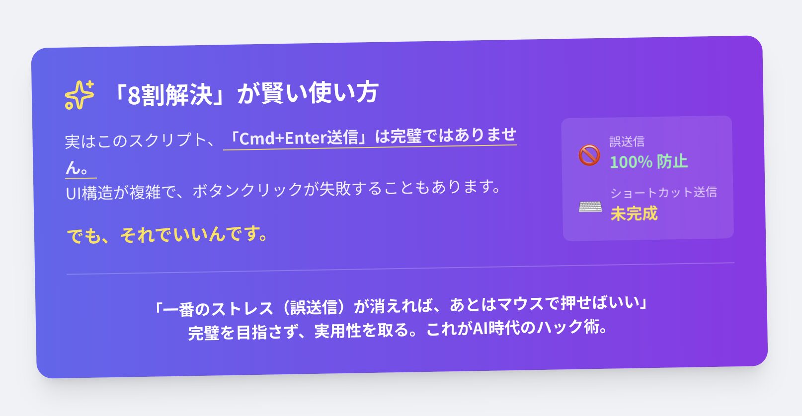 - 完成したスクリプトは「Enterキーでの誤送信防止」は完璧に動くが、「Cmd+Enterでの送信」機能はまだ未完成