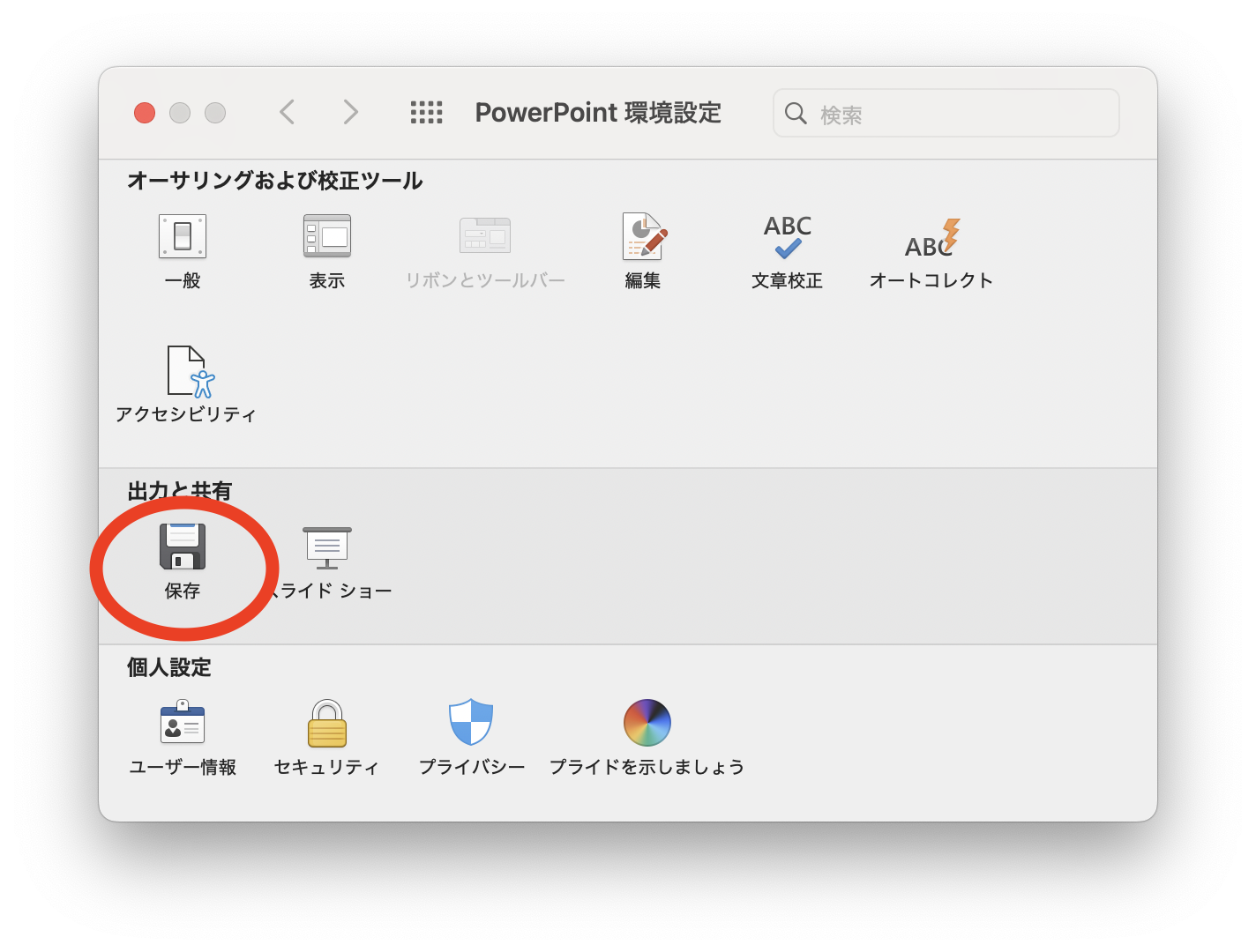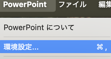 メニューの「PowerPoint」の下にある「環境設定」を開きます。