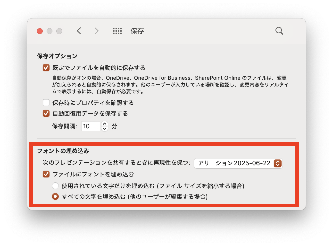 「ファイルにフォントを埋め込む」と「すべての文字を埋め込む」の2つにチェックを入れる。
