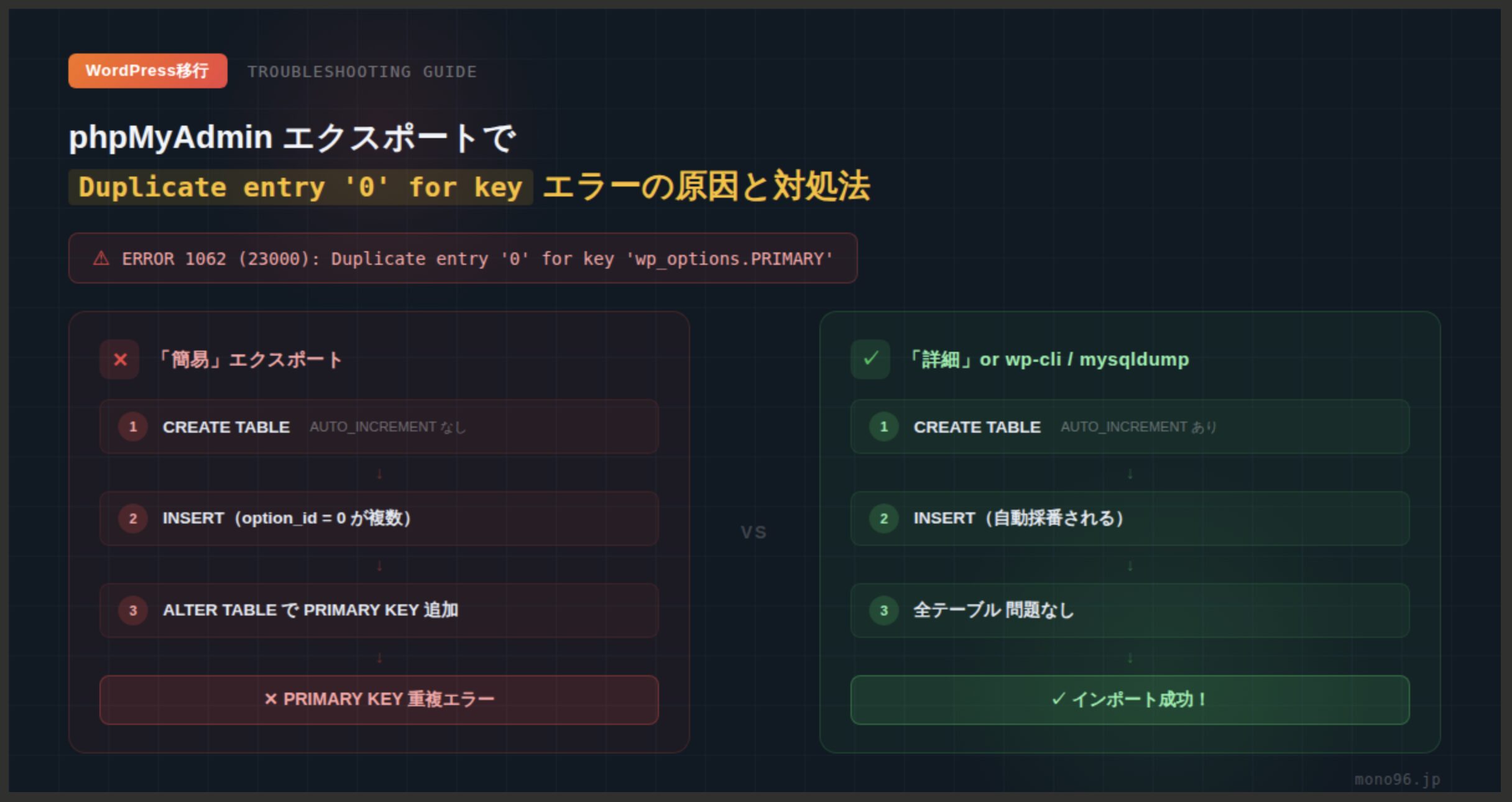 phpMyAdminでエクスポートしたSQLファイルのインポート時に「Dupli…