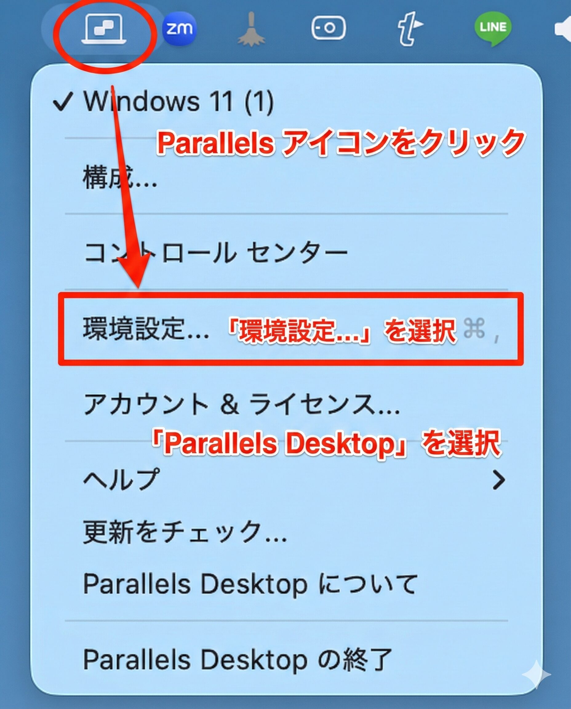 メニューバーのParallelsアイコンをクリックして、「環境設定…」を選択します。