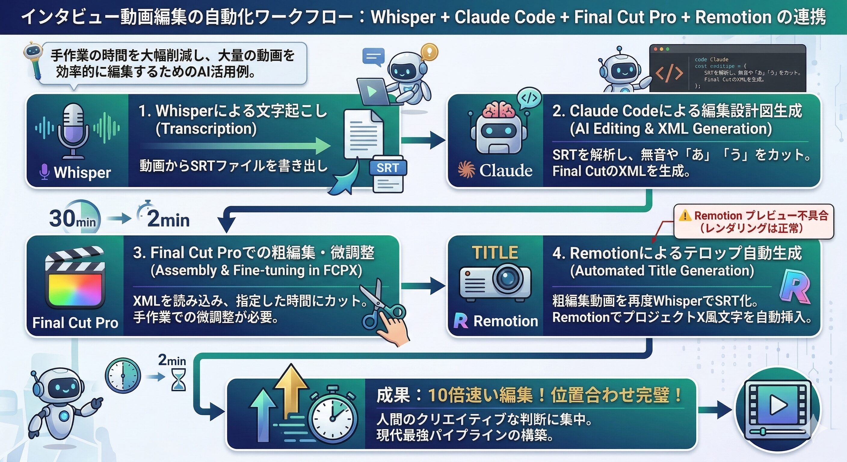 Whisper + Claude Code + Final Cut + Remotion でインタビュー動画編集をほぼ自動化した話