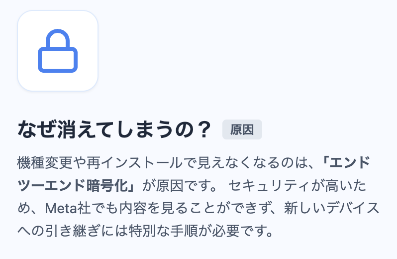 エンドツーエンド暗号化は、あなたと相手の間で送受信されるメッセージを保護する仕組みです。Facebook(Meta)でさえ内容を見ることができないため、プライバシーがしっかり守られます。(多分、きっと)