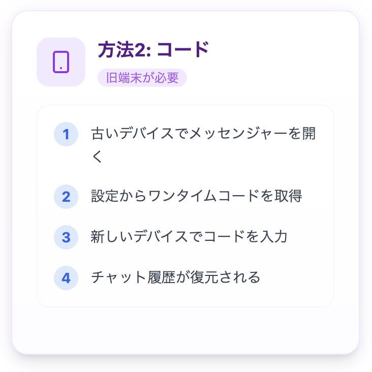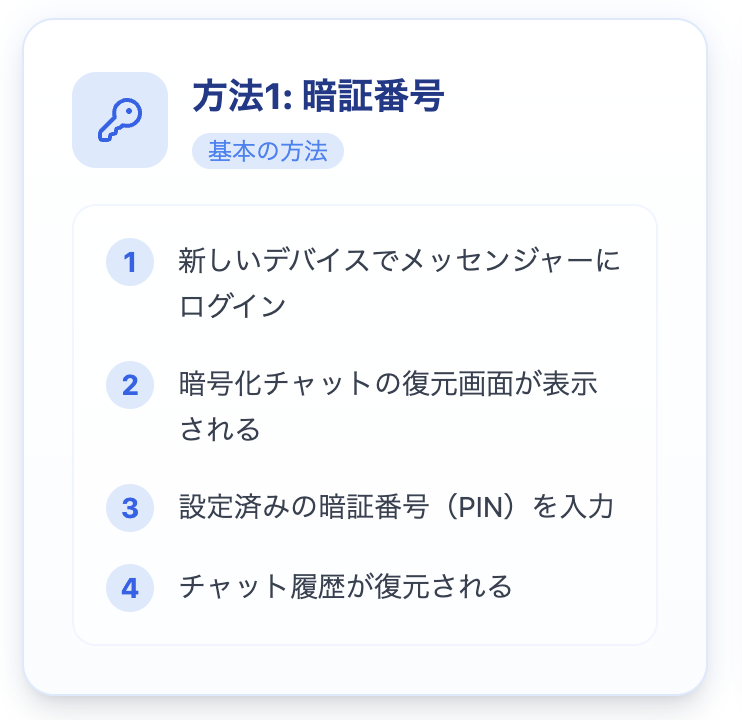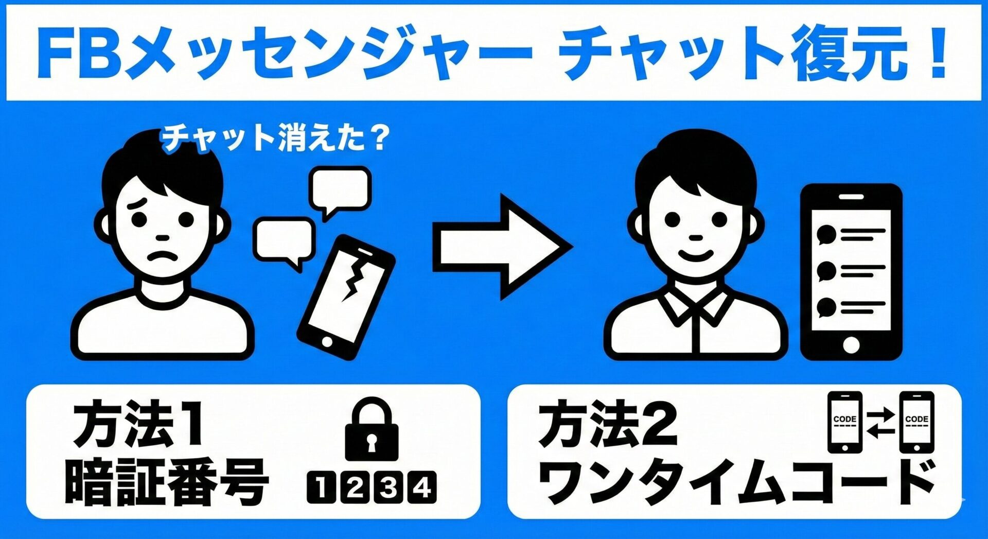 メッセンジャーの暗号化チャットが見えなくなった場合、慌てる必要はありません。暗証番号、またはワンタイムコードという2つの復元方法があります。