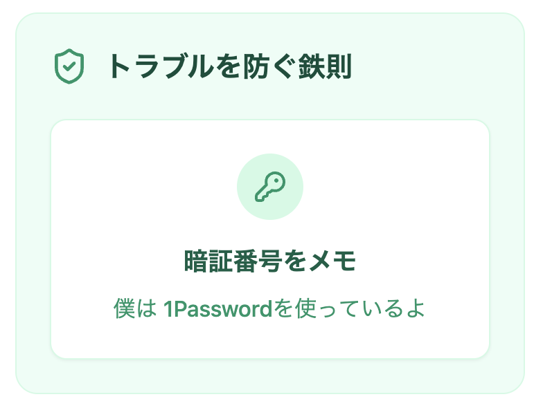 - 暗証番号は必ずメモしておく: 安全な場所に記録、僕は、1Passwordを使っているよ。