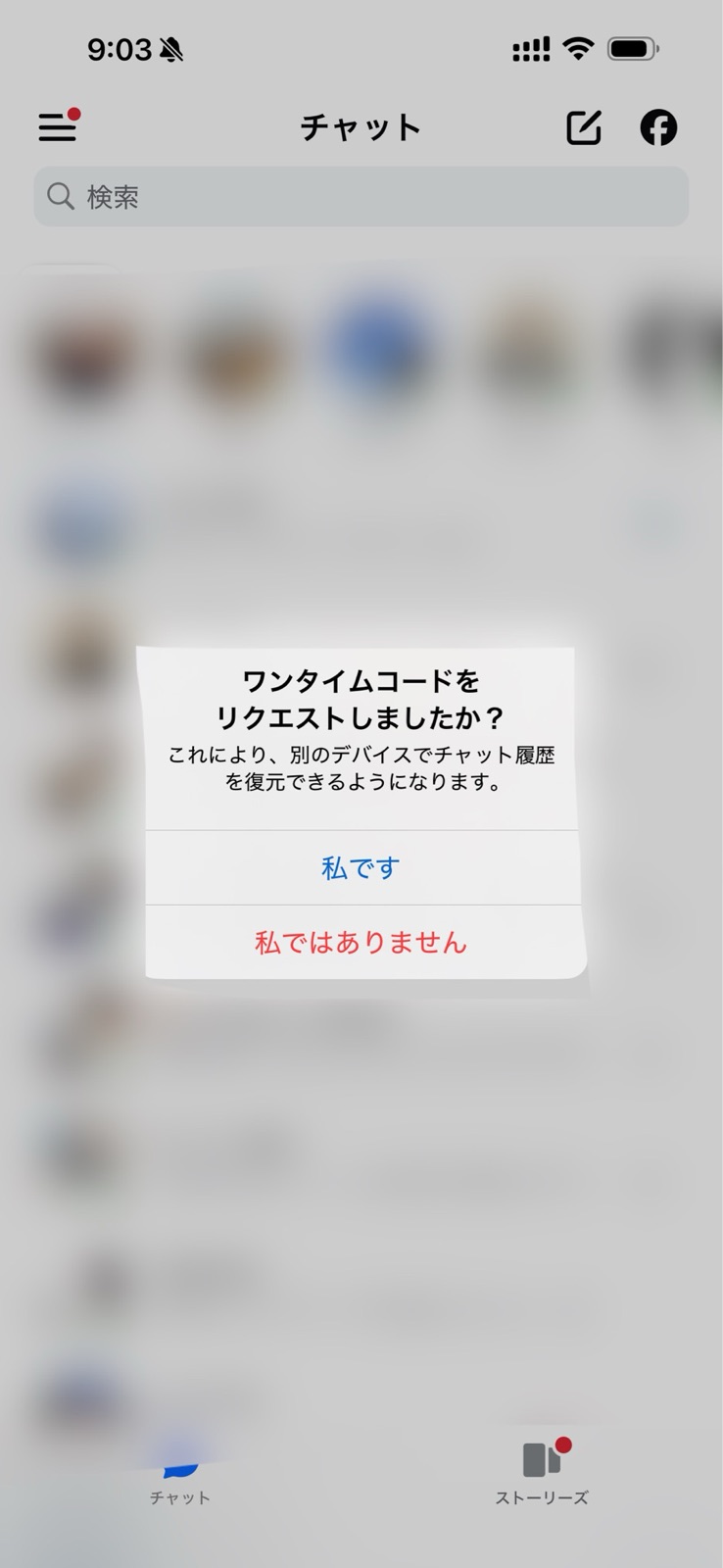 - モバイルのメッセンジャーアプリに「ワンタイムコードをリクエストしましたか」と質問が表示されるので、「私です」をタップ(心覚がない時は、 「私ではありません」を押してね)