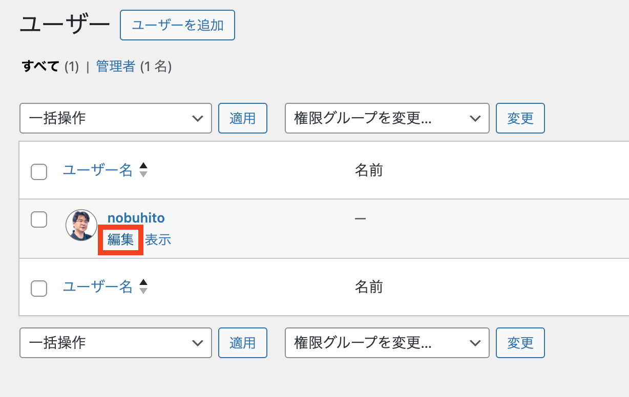 「ユーザー」をクリックして → 開いた画面のユーザー名の下にある「編集」をクリックします。