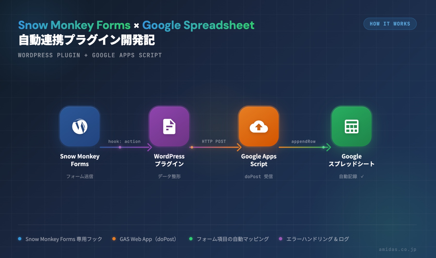 Snow Monkey Forms で受け付けた申込データを Google スプレッドシートに自動記録したい——そんな要望をいただき、WordPress プラグイン+Google Apps Script(GAS)の連携キットを開発しました。